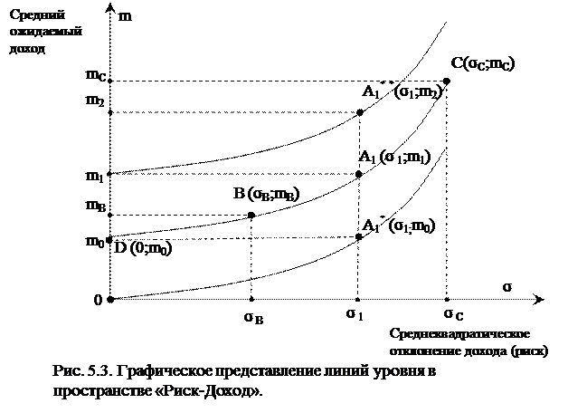 Здесь K1 – некоторая константа, отражающая «уровень» соответствующей линии в указанном пространстве при заданных параметрах (σ1;m1). Понятие «уровня» означает следующее. Все альтернативы, точки которых в пространстве «Риск-Доход» образуют одну кривую, эквивалентны друг другу и тем самым находятся на одном «уровне».