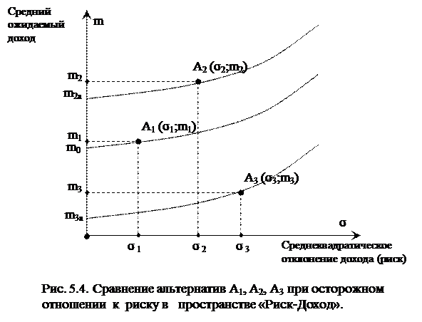 Как видно на рис. 5.1., при нейтральном отношении к риску наиболее предпочтительной для ЛПР является альтернатива A2 (σ2;m2), как имеющая наибольшее значение среднего ожидаемого дохода.