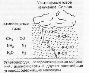 Первыми органическими соединениями были аминокислоты, образовавшиеся в первичном океаническом "бульоне" в результате взаимодействия циановодорода (HCN) и альдегидов в присутствии аммиака. Заметим, что, по некоторым данным, аминокислоты могут синтезироваться и в газовой фазе. Одновременно происходило образование простых сахаров (рибозы, дезоксирибозы) (рис. 2).