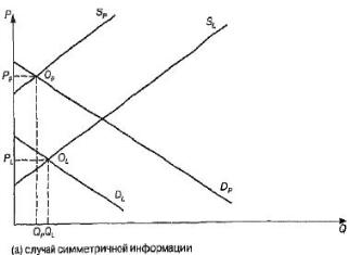 На графике (1) представлена ситуация, если бы каждый покупатель знал, что ему предлагает продавец. Фактически это был бы не единый рынок, а 2 независимых рынка на разнокачественные товары. Существовали бы 2 неодинаковые кривые DL - кривая спроса на «лимоны», DP - кривая спроса на «персики». кривая DP лежит правее DL. Ясно что по одной и той же цене покупатели захотят приобрести больше «персиков», чем лимонов. Так же бы возникли SP - кривая предложения «персиков» расположилась бы левее кривой SL - кривая предложения «лимонов», т.к. желающих предложить качественный товар за небольшие деньги будет меньше, чем готовых продать некачественную продукцию. И на рынке лимонов и на рынке персиков имеются точки пересечения кривых спроса и предложения(Ор и ОL). Существуют точки равновесия: рынком востребовано Qp персиков по цене Рр и QL лимонов по цене РL.