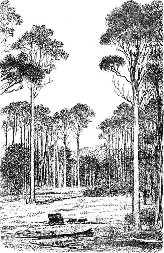 Впервые за всё время путешествия от мыса Барнуили отряд Гленарвана увидел опушку одного из тех австралийских лесов, которые покрывают площадь во много сот квадратных километров.