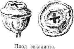 Плод у эвкалиптов — интересная коробочка в виде урночки, с крестообразным отверстием сверху, из которого высыпаются мелкие темно‑коричневые угловатые семена.