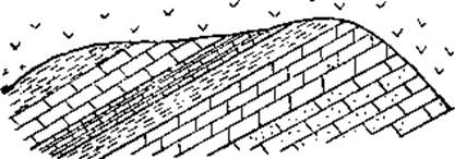 2. неоднородные массивные резервуары – толща пород неоднородна. Литологически она может быть представлена, например, чередованием известняков. Песков и песчаников, сверху перекрытых глинами. Проницаемость такой толщи в различных ее слоях колеблется. Но перемещение жидкости (воды, нефти) возможно во всех направлениях и происходит в общем независимо от наслоения пород (рис.2б).