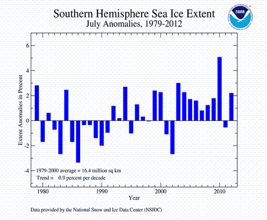 Площадь морского льда в Антарктике в июле 2012 года на 2,2% превысила среднее значение и стала 9-ой самой большой за 34-летнюю историю наблюдений.