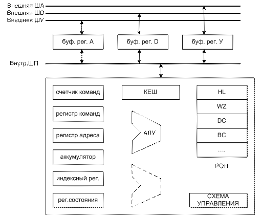 С помощью внутренних шин регистры связаны друг с другом. С другими блоками системы связь осуществляется под управлением программы.
