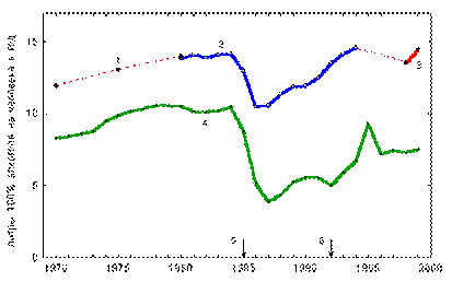 1 – американский советолог Владимир Тремл для 1970–1980; 2 – средняя оценка данных Госкомстата РФ, В.Тремла и А.Немцова для 1980–1994; 3 – А.Немцов для 1998–1999; 4 – Госкомстат РФ: регистрируемое потребление алкоголя; 5 – начало антиалкогольной кампании, 6 – начало рыночных реформ.