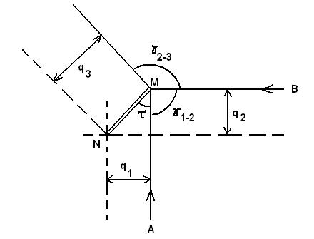 4. Отложить от направлений АМ,ВМ,СМ частные линейные величины крена по створам от станций А,В,С q1,q2,q3 (пунктирные линии)