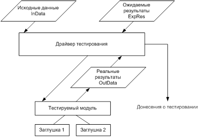 Драйвер — это управляющая программа, которая принимает исходные данные (InData) и ожидаемые результаты (ExpRes) тестовых вариантов, запускает в работу тестируемый модуль, получает из модуля реальные результаты (OutData) тестовых вариантов и формирует донесения о тестировании.