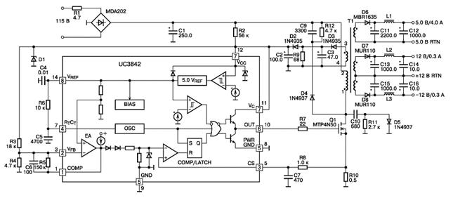 Микросхема ШИМ-контроллера UC3842 является самой распространенной при построении блоков питания мониторов. Кроме того, эти микросхемы применяются для построения импульсных регуляторов напряжения в блоках строчной развертки мониторов, которые являются и стабилизаторами высоких напряжений и схемами коррекции растра. Микросхема UC3842 часто используется для управления ключевым транзистором в системных блоках питания (однотактных) и в блоках питания печатающих устройств. Одним словом, эта статья будет интересна абсолютно всем специалистам, так или иначе связанным с источниками питания.