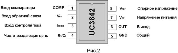 Рис. 1. Цоколевка микросхемы UC3842 (вид сверху)