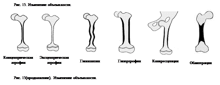 Изменения объема костей могут быть вследствие искривления, увеличения или уменьшения поперечника, увеличения или уменьшения длины, и, наконец, сочетания этих состояний.
