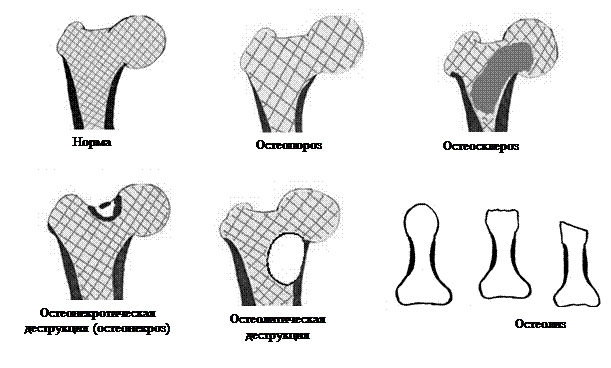 К основным изменениям костной структуры относят остепороз, остеомаляцию, зоны патологической перестройки, остеосклероз, остеолиз, деструкцию (рис. 15).