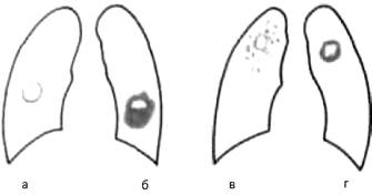 в - туберкулезная каверна; г - периферический рак легкого с распадом.