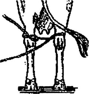 Можно использовать веревку длиной 3 — 4 м для одновременной фиксации обеих тазовых конечностей в области нижней трети голени.