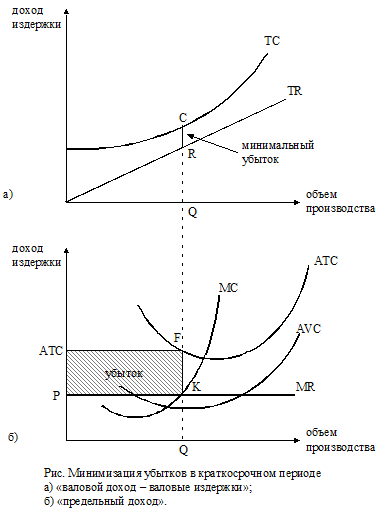 Минимизация убытков. В краткосрочном периоде у фирмы бывают ситуации, когда при существующей рыночной цене валовой доход (TR) не покрывает общие издержки (TC). В этом случае перед фирмой стоит задача минимизировать убытки.