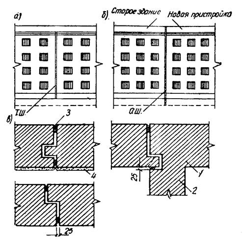 а – температурный; б – осадочный; в – конструкция швов (план).