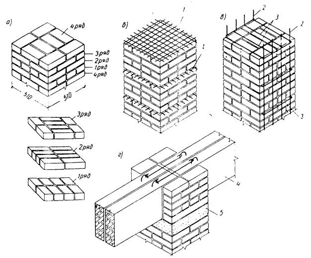 а – кладка кирпичного столба; б – армирование столба поперечное; в – то же, продольное; г – опирание на кирпичный столб сборного железобетонного прогона;