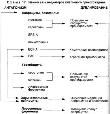 Наиболее ярко принцип дублирования выражен среди клеток — носителей вазоактивных веществ — лаброцитов, базофилов, тромбоцитов, а антагонистические начала — между этими клетками и эозинофильными лейкоцитами: медиаторы лаброцитов и базофилов стимулируют хемотаксис эозинофилов, последние же способны инактивировать эти медиаторы и фагоцитировать гранулы лаброцитов (схема 17). Среди клеток, несущих медиаторы сосудистой проницаемости, возникает "антагонистическое равновесие", определяющее своеобразие морфологии сосудистой фазы воспаления, особенно при аллергических реакциях.