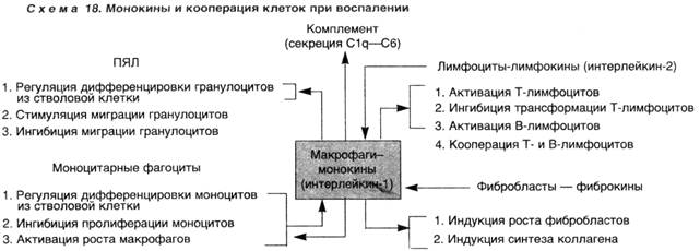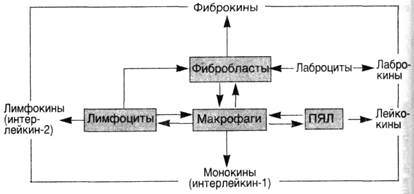 Клеточные медиаторы — лейкокины, монокины (интерлейкин-1), лимфокины (интерлейкин-2) и фиброкины — являются локальными регуляторами кооперации клеток на "поле" воспаления — ПЯЛ, макрофага, лимфоцита и фибробласта [Серов ВВ., Шехтер А.Б., 1981]. Другими словами, клеточные медиаторы определяют последовательность и долю участия в воспалении фагоцитарной и иммунной систем, с одной стороны, и системы соединительной ткани — с другой.