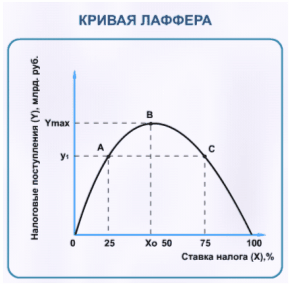 Американский экономист А. Лаффер исследовал взаимосвязь между величиной ставки налога и поступлениями в госбюджет средств от сбора налогов. Он установил следующую закономерность: повышение налоговой ставки обеспечивает большую величину налоговых поступлений лишь до определенного момента, а после него дальнейшее повышение ставки налога ведет к снижению стимулов производства, и таким образом общая сумма налоговых поступлений от предприятий сокращается.