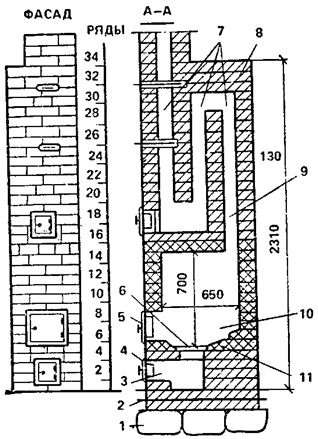 1 – фундамент; 2 – гидроизоляция; 3 – зольник; 4 – поддувальная дверка; 5 – топочная дверка; 6 – колосниковая решетка; 7 – дымоходы; 8 – перекрыша; 9 – жаровой канал; 10 – топливник; 11 – под
