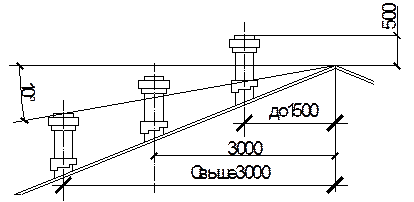 - не менее 500 мм над коньком кровли или парапетом при расположении трубы на расстоянии до 1,5 м от конька или парапета;