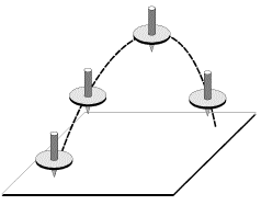 и направление оси симметрии гироскопа остается неизменным. В этом можно убедиться, поворачивая подставку, на которой расположен карданов подвес - при произвольных поворотах подставки ось гироскопа сохраняет неизменное направление в пространстве. По этой же причине волчок, "запущенный" на листе картона и подброшенный вверх (рис.90), сохраняет направление своей оси во время полета, и, падая острием на картон, продолжает устойчиво вращаться, пока не израсходуется запас его кинетической энергии.