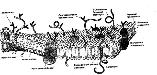Существует множество различных типов мембран, несущих различную функциональную нагрузку и отличающихся по структуре и молекулярной организации. Тем не менее, в настоящее время твердо установлено, что структурной основой всех биологических мембран является двойной слой фосфолипидных молекул. Плотность упаковки фосфолипидных молекул в мембране зависит от их жирнокислотного состава. Наличие в остатках жирных кислот цис двойных связей приводит к значительному разрыхлению фосфолипидного бислоя. Если в состав фосфолипидов входят более насыщенные жирные кислоты упаковка липидов бислоя становится более плотной. Еще более плотным фосфолипидный бислой становится благодаря наличию в мембранах неполярных стеринов, которые внедряются в мембрану между углеводородными хвостами и полярными головками фосфолипидов. Кроме фосфолипидов и стеринов в мембранах содержатся различные гликолипиды. Простейшие гликолипиды называются цереброзиды. Головку молекулы у них образует полярная гидрофильная углеводная группа, чаще всего галактоза (иногда глюкоза), а неполярная часть представлена длинноцепочечными хвостами сфингозина и этерифицированной жирной кислоты. Цереброзиды в большой концентрации содержатся в белом веществе мозга. Другой большой клас гликосфинголипидов, т.н. ганглиозиды – это сложные богатые углеводами и сиаловыми кислотами молекулы крупного размера (мол. м. до 3000). Они особенно многочисленны в сером веществе мозга, участвуют в создании микроокружения синапсов и медиаторных рецепторов. Гликолипиды всегда располагаются на наружной поверхности мембраны, а их гидрофильный олигосахаридный фрагмент выступает в окружающую среду.