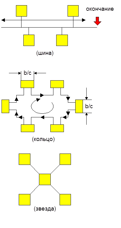 Структура типа «шина», рисунок 2(а), проще и экономичнее, так как для нее не требуется дополнительное устройство и расходуется меньше кабеля. Но она очень чувствительна к неисправностям кабельной системы. Если кабель поврежден хотя бы в одном месте, то возникают проблемы для всей сети. Место неисправности трудно обнаружить.