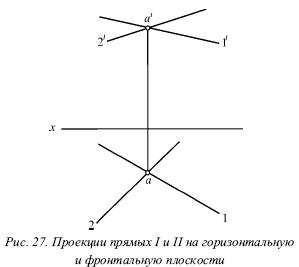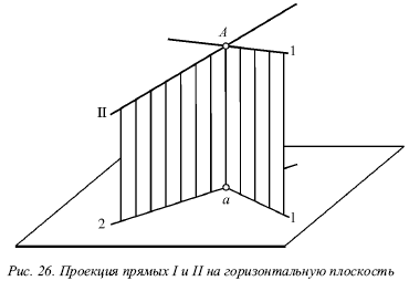 Рассмотрим прямые I и II, которые пересекаются в точке А (рис. 26). Спроецируем обе прямые на горизонтальную плоскость. Если учесть, что точка А принадлежит обеим прямым, то ее проекция а будет принадлежать также и обеим проекциям прямых.