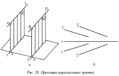 На самом деле, плоскости Р и Q, проецирующие прямые I и II на горизонтальную плоскость, параллельны, так как в каждой из этих плоскостей можно указать две пересекающиеся прямые, параллельные двум пересекающимся прямым второй плоскости, т. е. прямая I параллельна прямой II, и проектирующий луч Аа параллелен лучу Вb. Но две параллельные плоскости Р и Q пересекут горизонтальную плоскость. В результате этого образуются две параллельные прямые 1 и 2, т. е. горизонтальные проекции прямых I и II параллельны между собой.