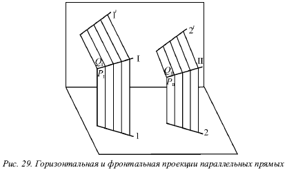 Если известно, что горизонтальные и фронтальные проекции прямых I и II параллельны, будет справедливо следующее: 1 || 2 и 1́|| 2́ (рис. 29).