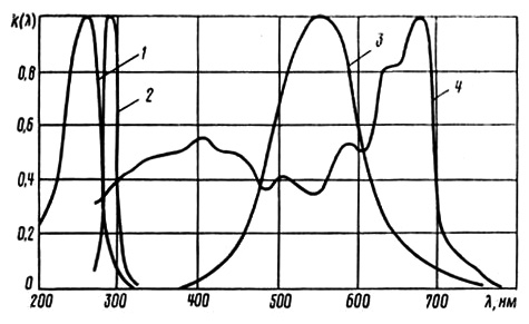 На рисунке 1.2 показаны стандартизированные (усреднёные) функции относительной спектральной чувствительности некоторых типовых приемников оптического излучения, которые можно также расценивать как функции относительной спектральной эффективности фотобиологических воздействий: 7 — бактерицидного, 2 — витального (эритемного), 3 — светового и 4 — фотосинтезного. В соответствии с этим различают и системы эффективных величин и единиц их измерений: бактерицидную, витальную, световую и фотосинтезную.