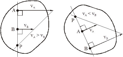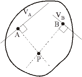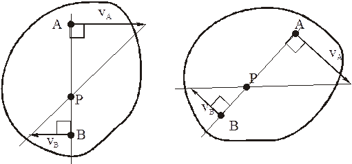 Рассмотрим только случай 2). Пусть известны направления скоростей двух точек А и В фигуры. Тогда для нахождения МЦС надо из этих точек опустить перпендикуляры к направлениям скоростей. В точке пересечения этих перпендикуляров и будет МЦС.