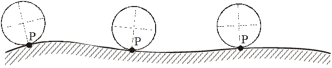 Если колесо всё время остаётся в вертикальной плоскости, и отсутствуют повороты вокруг вертикальной оси, то оно совершает плоскопараллельное движение. В этом случае положение МЦС сразу известно: в точке контакта колеса с поверхностью. Действительно, если нет скольжения, то скорость точки контакта равна скорости соответствующей точки поверхности, т.е. нулю (поверхность неподвижна). По определению МЦС – здесь он и находится.