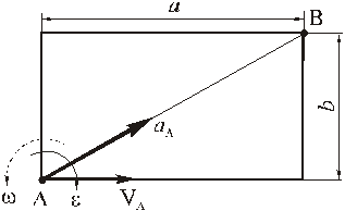 Прямоугольная пластина со сторонами a = 0,4 м и b = 0,3 м движется в своей плоскости. В данный момент времени скорость точки А пластины равна по модулю vA = 4 м/с, модуль ускорения этой точки равен aA = 3 м/с2, модули угловой скорости и углового ускорения фигуры равны соответственно