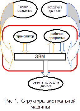 На рисунке (Рис.1) показана структура такой машины. Ее процессором является ЭВМ, которая используется дважды. На первом этапе (фаза трансляции) программа, выполняемая ЭВМ – это транслятор, а исходные данные – текст программы на языке высокого уровня. Результатом будет перевод такой программы в исполняемую программу или так называемый машинный код. Далее ЭВМ будет выполнять машинный код (фаза времени выполнения – run time, голубые стрелки). Исходными данными здесь послужат исходные данные самой задачи, а результатом – данные, определяющие ее решение.