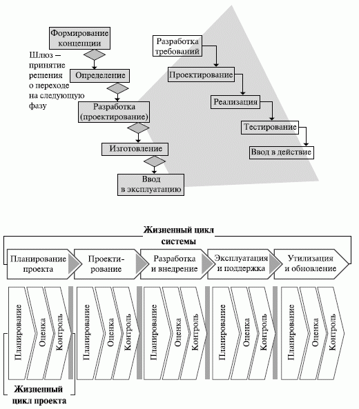 Приведенные этапы есть стадии жизненного цикла информационной системы и не тождественны жизненному циклу проекта. Жизненный цикл продукта отражает, что нужно сделать для создания, эксплуатации, поддержки и утилизации данного продукта, а жизненный цикл проекта - как нужно организовывать и управлять работой.Фаза ЖЦ продукта может включать в себя все этапы ЖЦ проекта (см. рис. 1.1 (а, б)), и, в соответствии со стандартом ГОСТ Р ИСО/МЭК 15288 [10], предусматривает наличие этапов планирования, оценки и контроля, а также процесса принятия решения - шлюза (см. рис. 1.1. (а)), через который происходит переход на следующий этап ЖЦ ИС и который является точкой мониторинга качества и точкой принятия решения о целесообразности продолжения проекта [10]. Необходимо отметить, что планирование, оценка и контроль характерны для любого цикла управления (например, цикл Деминга). Таким образом, использование их, в том числе на этапе "Эксплуатация и поддержка", носящем выраженный операционный (не проектный) характер, вполне обосновано.