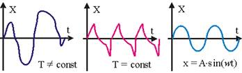 Колебания называются периодическими, если значения физических величин, изменяющихся в процессе колебаний, повторяются через равные промежутки времени рис.1. (В противном случае колебания называются апериодическими). Выделяют важный частный случай гармонических колебаний (рис.1).