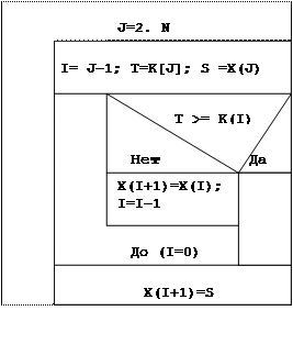 запись Х(j) временно размещается в запись S и просматриваются записи Х(j-1), Х(j-2),..., Х(1); их ключи сравниваются с ключом T записи S и записи сдвигаются вправо, если обнаруживается, что их ключи больше ключа Т.