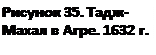 Величественное и пропорциональное здание Тадж-Махала — квадратное в плане, с четырьмя минаретами по углам и большим куполом, точное и строгое и вместе с тем исключительно гармоничное по композиции и деталям — богато и изысканно украшено инкрустацией самоцветами по белому мрамору. Декоративное убранство дополняет каллиграфически точно выполненный орнамент из черного мрамора.