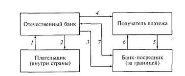 1 — платежное поручение; 2 — запись в дебет счета клиента; 3 — выписка чека (отечественный банк выставляет чек на зарубежный банк); 4 — отправка чека получателю платежа; 5 — предъявление чека банку-посреднику; 6 — запись эквивалента в кредит счета; 7 — запись в дебет счета отечественного банка, выписавшего чек