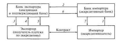 1 — после заключения договора купли-продажи импортер дает поручение своему банку открыть аккредитив в пользу продавца; 2 — банк импортера (аккредитивный банк) пересылает банку экспортера (авизующему банку) письмо с сообщением об открытии аккредитива в пользу экспортера; 3 — банк экспортера сообщает продавцу об открытии аккредитива и подтверждает его; 4 — после отгрузки товара экспортер собирает требуемые аккредитивом документы и передает их своему банку; 5 — банк проверяет документы, и в случае, если они соответствуют условиям аккредитива, экспортеру выплачивается контрактная стоимость товара; 6 — банк экспортера передает документы аккредитивному банку; 7 — против оплаты контрактной стоимости товара аккредитивный банк выдает импортеру документы, с помощью которых он может получить товар