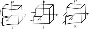 В развитии трещины различают три простейших типа смещения ее берегов относительно друг друга в соответствии с действием различных внешних нагрузок (рис. 2.2). При деформации растяжения (схема I) возникает трещина отрыва, когда ее поверхности смещаются (расходятся) в направлениях, перпендикулярных к поверхности трещины; при деформации поперечного сдвига (схема II) поверхности берегов трещины смещаются поперек ее передней кромки; при нагрузке по схеме III образуются трещины продольного сдвига, при котором точки поверхности трещины смещаются вдоль ее передней кромки. Очевидно, если на тело с трещиной действует произвольная нагрузка в области применимости закона Гука, на основании принципа суперпозиции любое смещение берегов развивающейся трещины можно представить в виде суммы приведенных трех типов смещений.