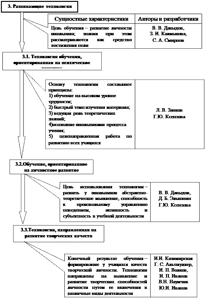 В таблице 1.1. представлен банк педагогических технологий, который дает возможность ознакомиться с сущностными характеристиками и особенностями каждой технологии, а также узнать авторов и разработчиков этих технолологий.