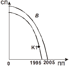Если в двух странах, имеющих одинаковые КПВ точки, отражающие их положение очень различаются, то преимущество в развитии получает страна, производящая больше СП. С помощью модели КПВ иллюстрируется закон возрастающих затрат или альтернативных издержек. Под альтернативными издержками понимается объем производства некоторого товара, от которого следует отказаться, чтобы получить требуемое количество другого продукта. Закон объясняется технической не заменяемостью различных производств.