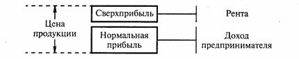 Рентные отношения представляют собой отношения между собственником земли и арендатором по распределению прибыли. Одна ее часть - в виде обычной прибыли - достается предпринимателю, а другую долю - в форме сверхприбыли - получает земельный собственник (рис. 1).
