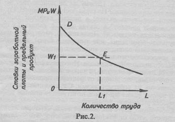 Из графика на рис. 2 видно, что владелец фермы будет нанимать дополнительных рабочих (т. е. продвигаться по оси ОL) до тех пор, пока предельный продукт, создаваемый наемным рабочим, не сравняется с размером заработной платы. Это количество нанимаемых работников достигает величины L1, когда размеры предельного продукта равны W1, т.е. совпадают с уровнем зарплаты. Заработная плата всех сельскохозяйственных рабочих составит площадь 0L1EW1. А что представляет собой остальная площадь, т.е. фигура DEW1. Это и есть величина земельной ренты. Можно сказать, что размер земельной ренты мы определили «остаточным методом, когда из общей величины созданного продукта вычли совокупную величину заработной платы». П. Самуэльсон, в частности, подчеркивает, что рента «…должна присваиваться владельцем земли как остаточный доход. Кто еще бы мог претендовать на этот остаточный доход в условиях системы частной собственности?» (Самуэльсон П. Экономика. М., 1964. С. 589).