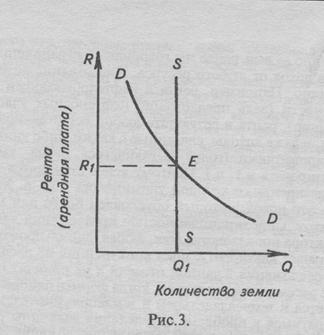 Принцип установления ренты, или арендной платы (неоклассики часто используют эти два понятия как синонимы) как уравновешивающей цены таков же, как и в случае других факторов производства. Например, заработная плата выступает как цена, выравнивающая спрос и предложение труда; процент — уравновешивающий спрос и предложение капитала. Еще раз напомним, что предложение земли отличается низкой эластичностью или вообще неэластичностью. Следовательно, графически кривая предложения земли будет представлять собой вертикальную линию (рис. 3).