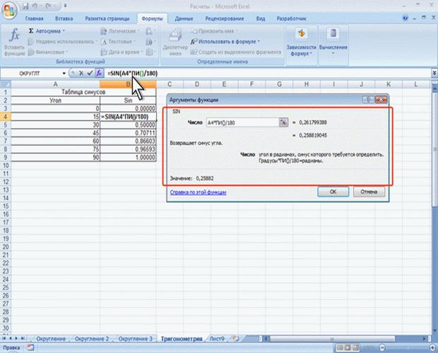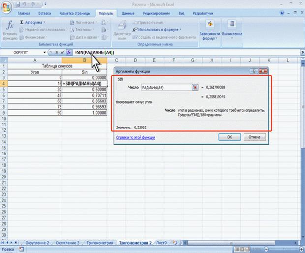 Функции ГРАДУСЫ и РАДИАНЫ удобно использовать с тригонометрическими функциями. Например, при необходимости рассчитать значение синуса угла, указанного в градусах (рис. 7.4), или рассчитать в градусах значение арксинуса.